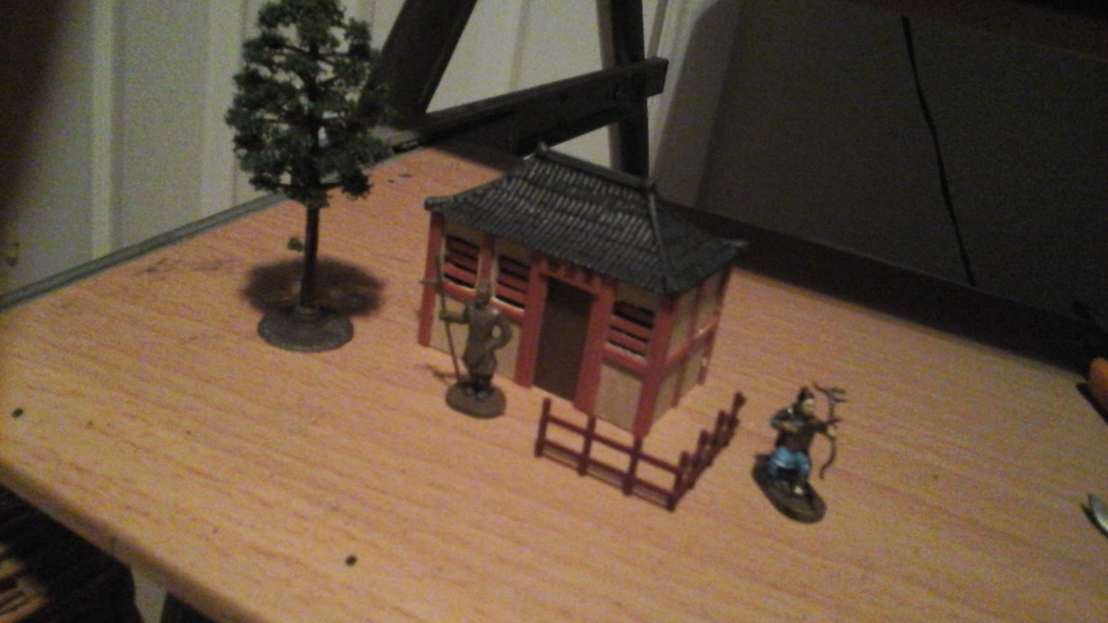 The advantage of the Wills Pagoda building roof is that you could buy two or more, carefully cut them apart and glue them together for a longer roof. This is much easier than trying to scratchbuild symmetrical curved roof shapes. The roof could also be used for a gatehouse building or the top floor of a tower as in one of the top ceramic buildings. That said this is not the only style of tiled roof as straight rooves appear to be common as well as well as gabled rooves. Thatch would also not look out of place. That said I am not an archaeologist.